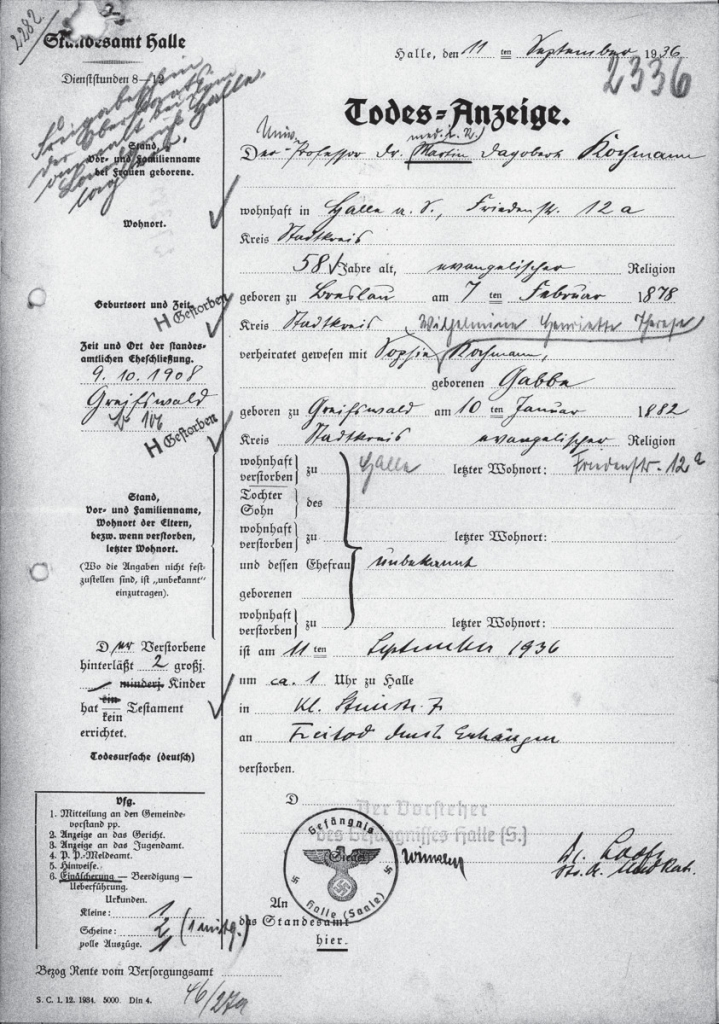 ist am 11. September 1936 um ca. 1 Uhr [mittags] zu Halle, Kleine Steinstr. 7 an Freitod […] verstorben.